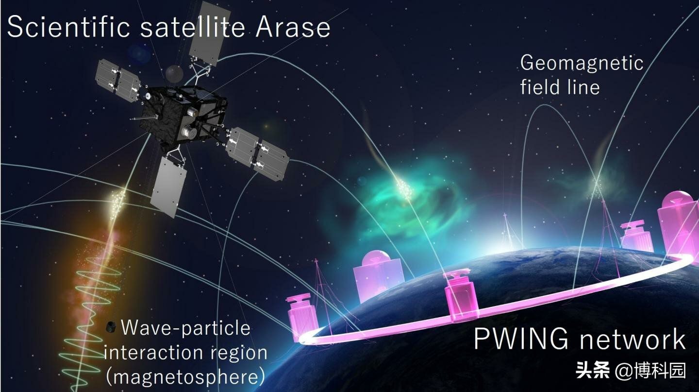 - (图1)利用科学卫星Arase和地面观测网络PWING进行协调观测的示意图。通过科学卫星Arase在磁层中的详细观测,以及从地面沿地磁场线观测极光,可以研究和捕捉波粒相互作用产生区域的空间分布。图片:(c) JAXA