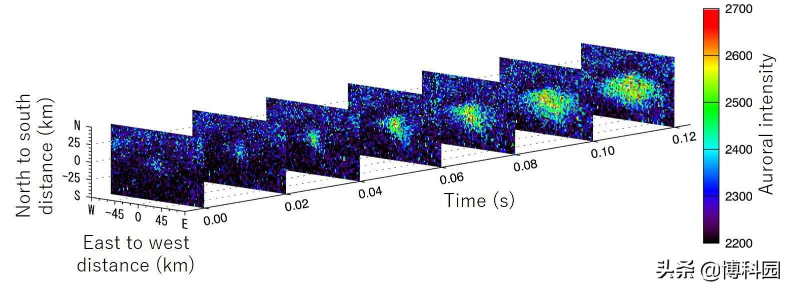 - (图3)强度变化1个像素表示沿地磁力线的时间变化,形态变化表示沿地磁力线的空间变化。图片:Kanazawa University