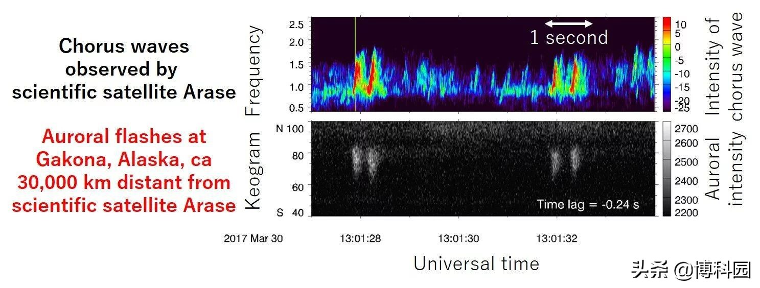 - (图2)由科学卫星Arase观测到的持续数百毫秒的合唱波与美国阿拉斯加Gakona观测到一道闪光极光的一对一对应。图片:Kanazawa University