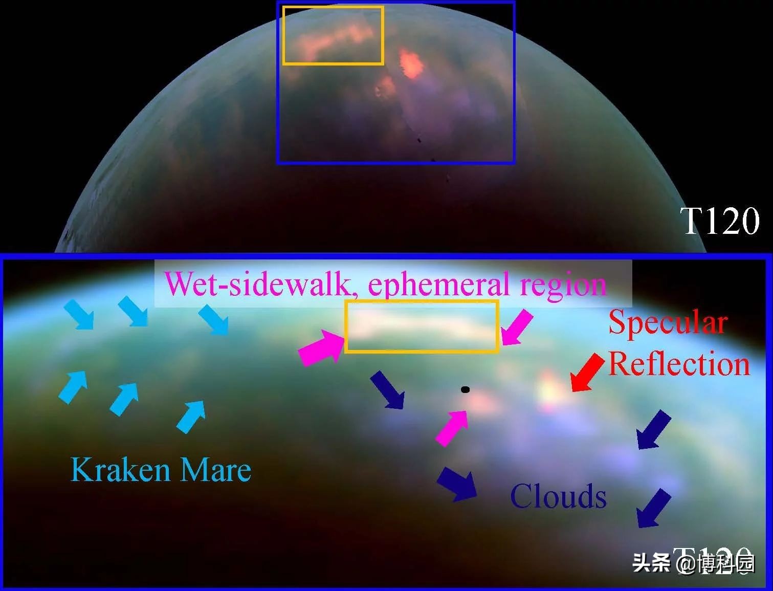 土卫六北极,由卡西尼号的视觉和红外绘图光谱仪拍摄到,橙色显示的是“潮湿的人行道”区域,分析表明这是泰坦北极季节变化和降雨的证据。蓝色框显示底部面板中的展开区域。下图是泰坦北极的放大图。深蓝色的箭头表示云。红色的箭头标记着来自一个叫做索洛特兰湖的镜面反射。粉红色箭头表示“潮湿的人行道”区域。这个黑点标出了土卫六的北极。淡蓝色箭头标记着北极最大的海。图片:NASA/JPL/University of Arizona/University of Idaho.