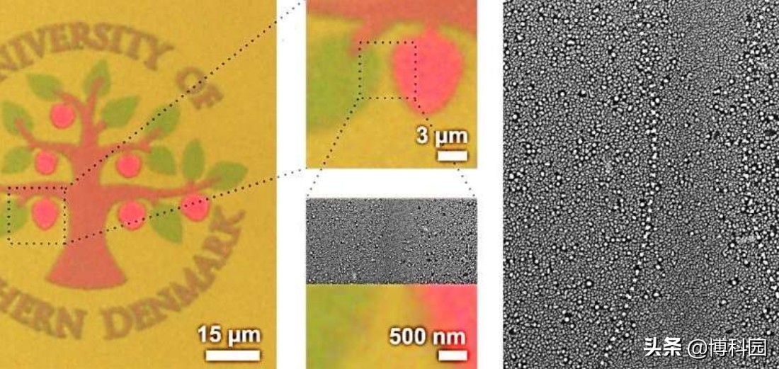 - SDU标志的微观图像是用结构颜色绘制,是用圆偏振光书写,用非偏振光观察。右上角的SEM图像显示是纳米级结构,不同颜色区域的边界用白色虚线表示。图片:Roberts et al. ©2018 American Chemical Society