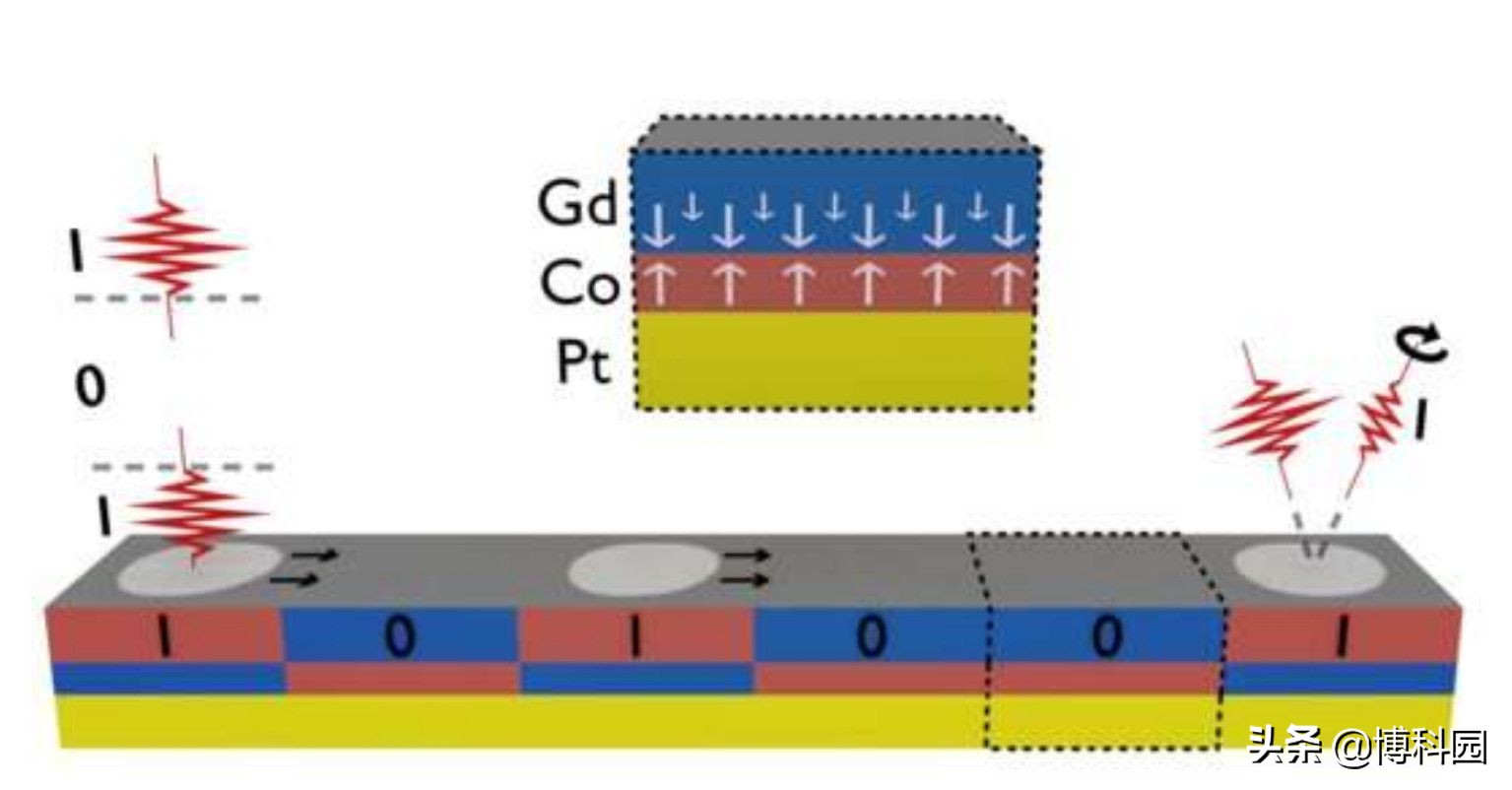存设备中实时写入数据,磁位(1和0位)由激光脉冲(红色脉冲,左侧)写入,数据沿跑道传输到另一侧(黑色箭头)。在未来,数据也可能被光学读出(红色脉冲,右侧)。图片:Eindhoven University of Technology