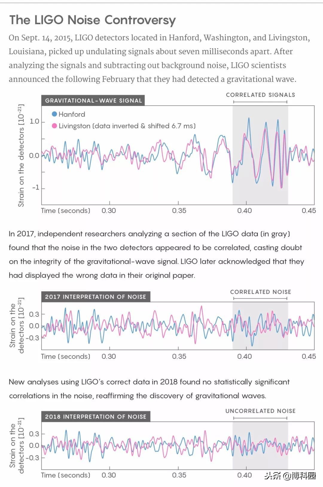 当格林和莫法特打开这两组噪音数据的窗口时,相关性就消失了。格林说:我们担心哥本哈根小组所做的计算是为了得到他们想要的结果。尼尔森和他的合著者——亚历山大·尼茨,科林·卡帕诺和邓肯·布朗也得出结论:研究者声称噪声的相关性并不是真实。这个错误的部分原因要归于2016年LIGO在《物理评论快报》(alReviewLetters)发表论文的第一个图中提供了错误数据。雪城大学(Syracuse University)的引力波天文学家布朗说:图1是人们纹在胳膊上的东西。布朗是LIGO的前成员,2018年年离开了合作项目,对数据进行独立分析。图顶部显示了并排的弯曲线条,代表了在利文斯顿和汉福德探测到的引力波信号。