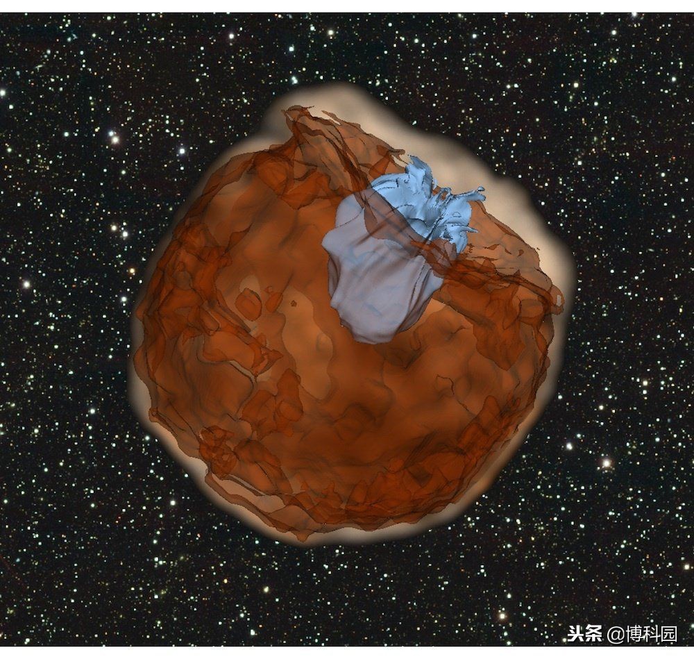 超新星爆炸(褐色)撞击伴星的模拟,这导致一些超新星喷出物发出蓝光,并在喷出物上形成一个洞,结果是爆炸后不久超新星的亮度发生了碰撞。图片:Dan Kasen (Berkely/LBNL)