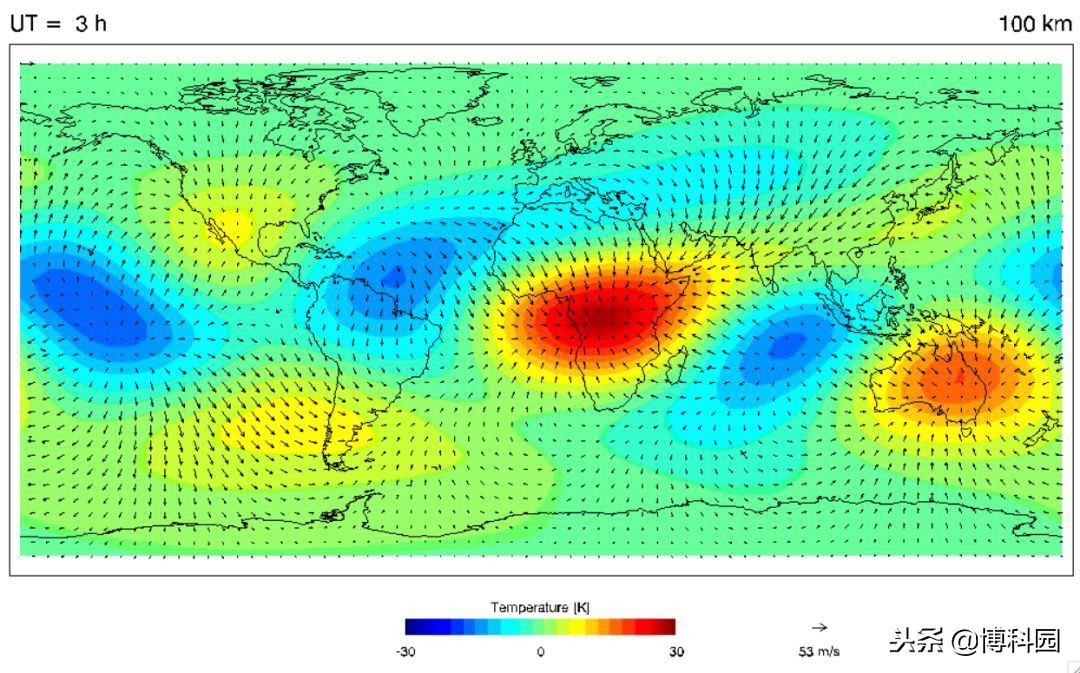 根据热球、电离层、中间层、能量学和动力学(定时)卫星的观测,绘制了一幅2005年9月大气中潮汐温度的动画。图片:NASA/Jensob/Wikimedia Commons