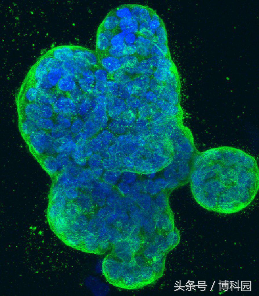 上图示为人乳腺癌细胞的三维培养,DNA染蓝,细胞膜蛋白染绿。2014年由美国国立卫生研究院IRP的Tom Misteli博士和Karen Meaburn博士创建的图像。