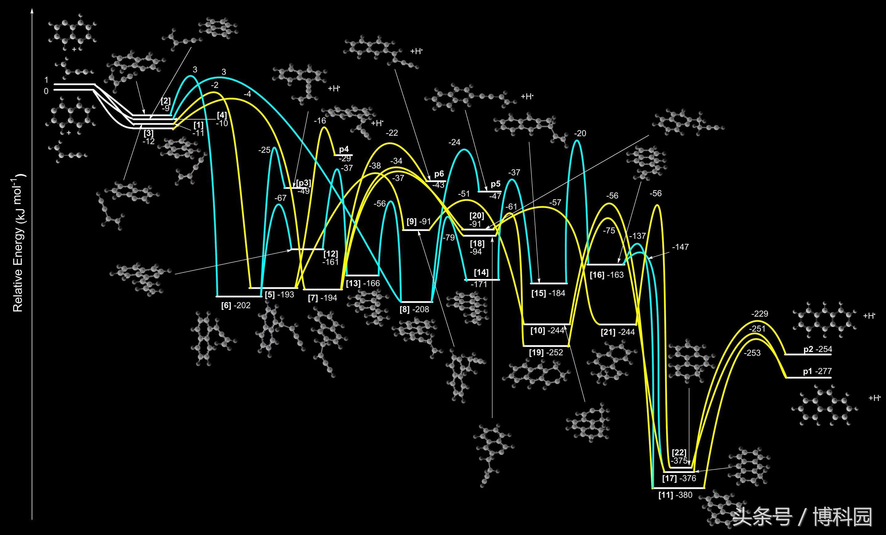 这张图表显示了在涉及萘基和乙烯基乙炔气体的化学反应过程中的势能面计算,这些气体的结合能产生许多化合物,包括三环分子结构。图片: Long Zhao, Ralf I. Kaiser, et al., Nature Astronomy, DOI: 10.1038/s41550-018-0585-y