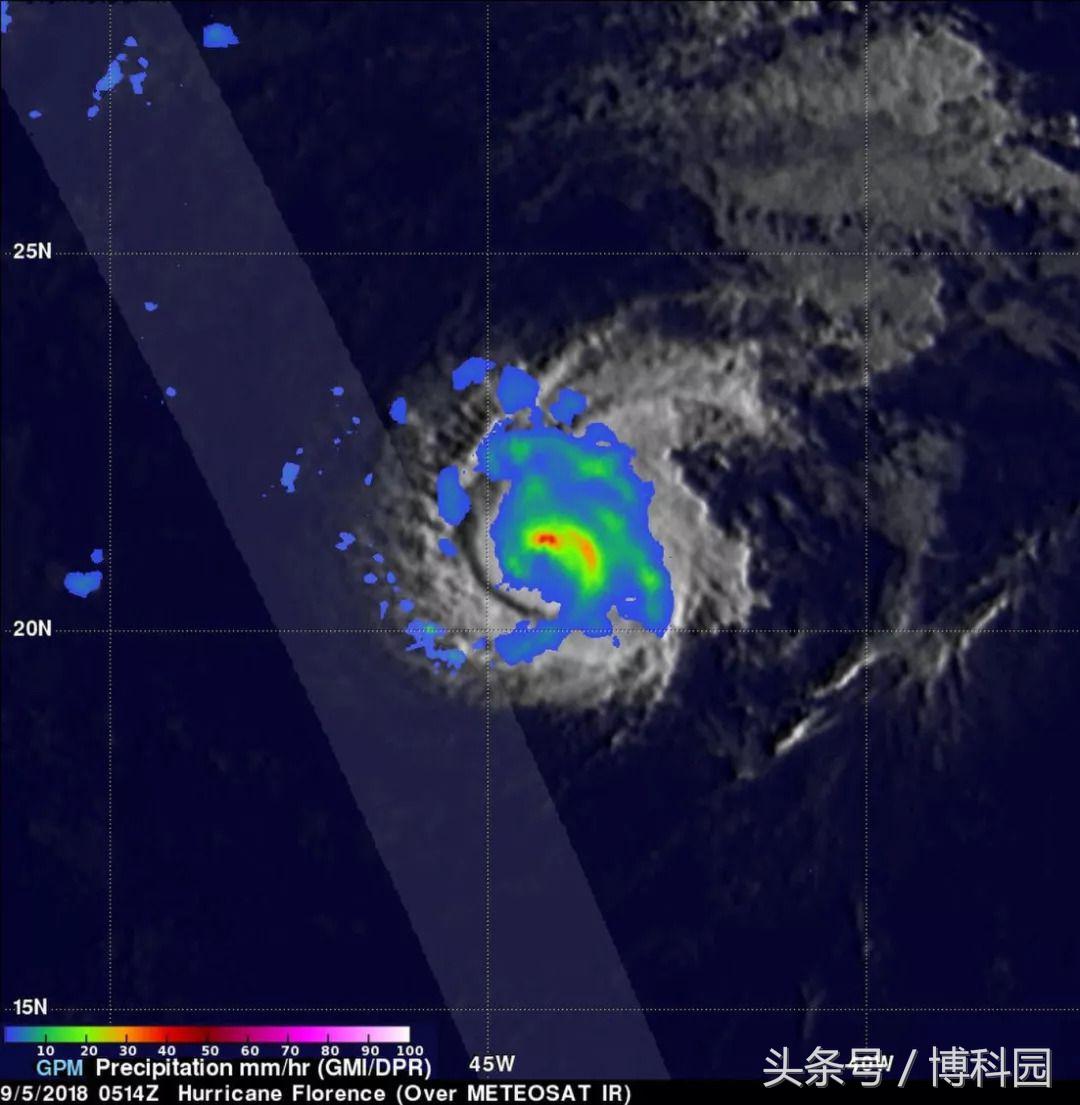 2018年9月5日,JAXA-NASA的GPM核心天文台卫星显示,佛罗伦萨飓风眼以北的风暴正以每小时2英寸(5厘米)的速度产生强降雨(红色)。该卫星的双频降水雷达仪器扫描了飓风西面几乎没有降雨的地区。图片:Hal Pierce/JAXA/NASA