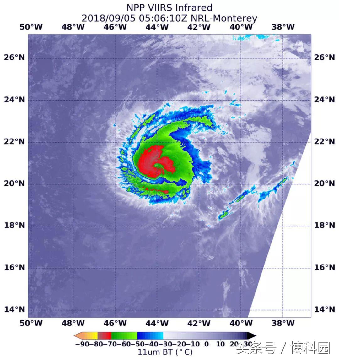 2018年9月5日,美国东部时间凌晨1:06(格林尼治标准时间0506),NASA-NOAA Suomi-NPP卫星上的VIIRS仪器提供了佛罗伦萨飓风的红外图像。最强的雷暴和最冷的云顶出现红色。图片:NOAA/NASA/NRL