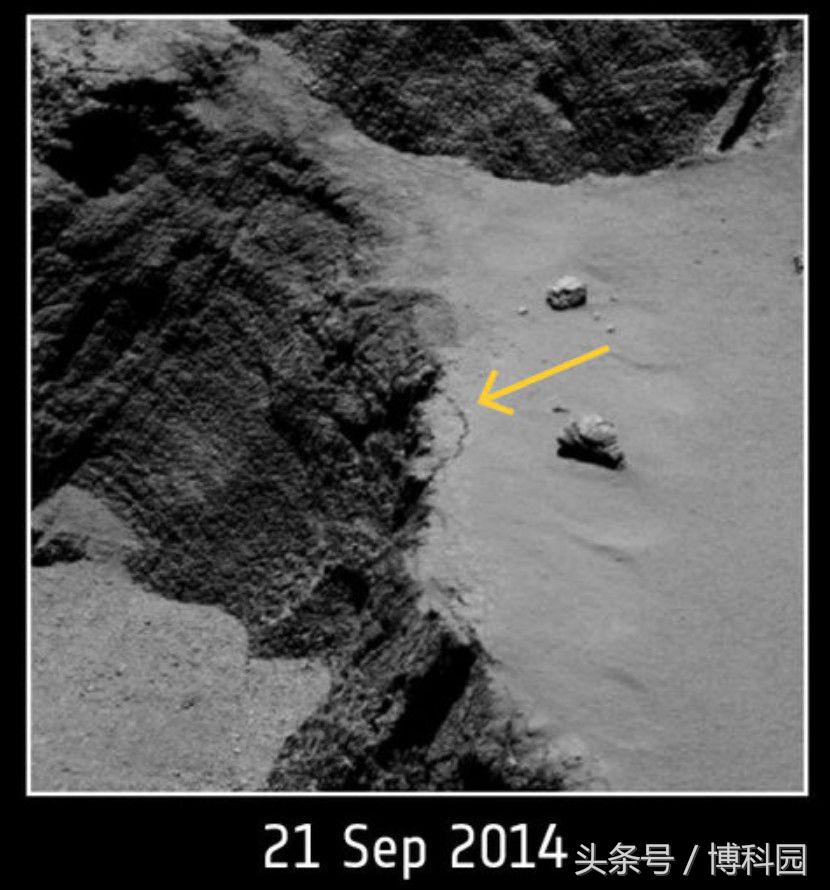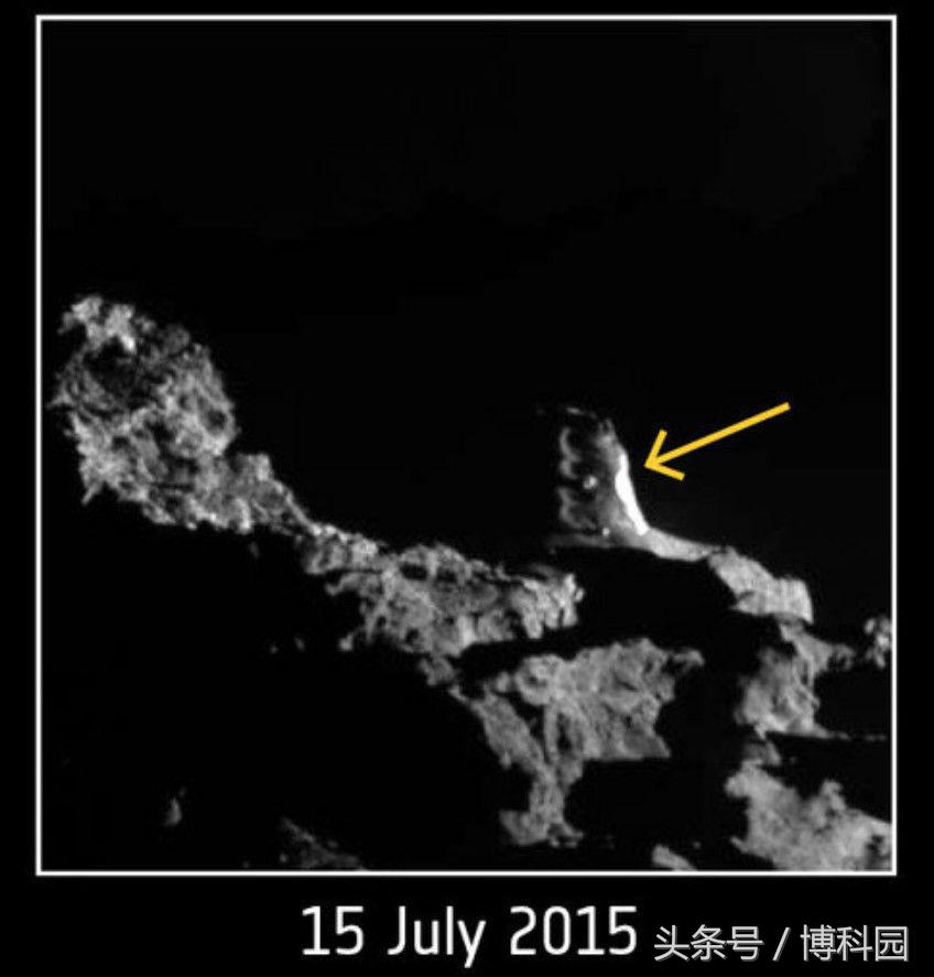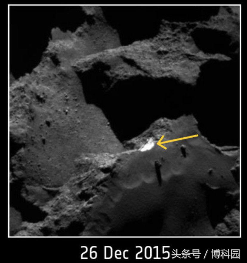(本文全部配图说明)在67P/ Churyumov-Gerasimenko彗星上显示阿斯旺悬崖崩塌不同视图的序列图像。第一张图片显示的是骨折在2015年7月10日消失之前很久。在7月15日和12月26日拍摄的照片显示了在7月10日发生的岩崩中暴露出来的明亮的、原始的物质。虽然从这些图像看不太明显,但在12月26日的图像中,亮度已经减弱了大约50%,这表明大部分暴露在外的水冰在那个时候已经升华了。