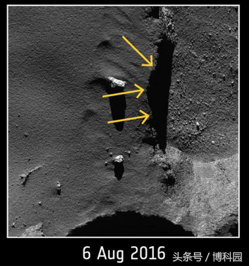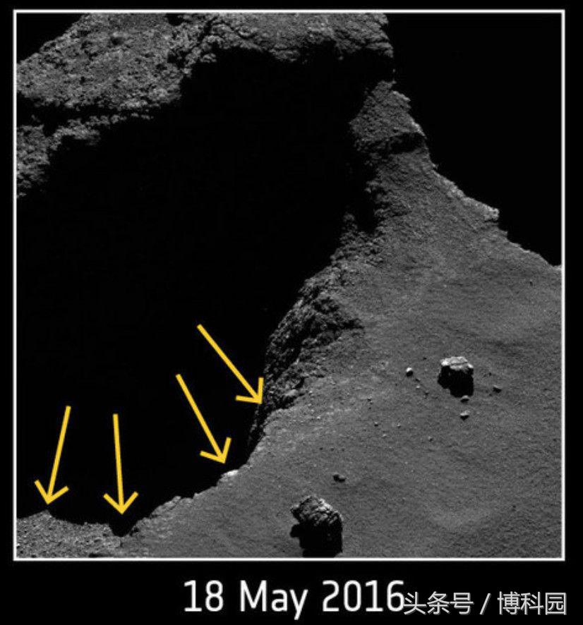 (接上)2016年的图片显示了新悬崖顶部的不同视图。到2016年8月,大部分悬崖表面恢复到彗星的平均亮度。用箭头标出裂缝和裸露的水冰,勾勒出新的悬崖顶部轮廓。图片:ESA/Rosetta/MPS for OSIRIS Team MPS/UPD/LAM/IAA/SSO/INTA/UPM/DASP/IDA
