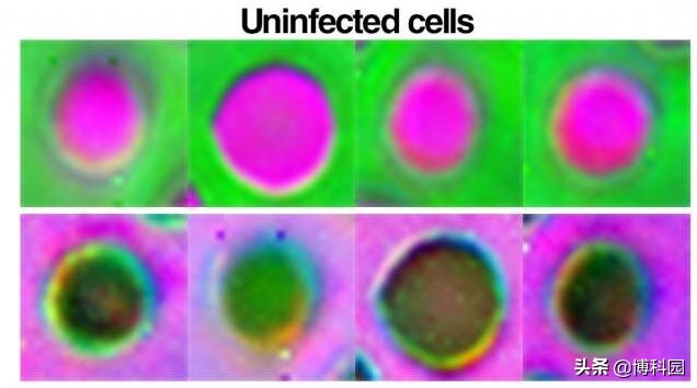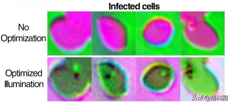 但是计算机可以看到人类看不到的东西,因此不仅重新设计了硬件,提供了多种照明选择,还允许显微镜为自己优化照明。工程师们没有从下方扩散白光来均匀地照亮幻灯片,而是开发了一种碗状光源,整个表面都嵌入了LED。这使得样品可以用不同的颜色从不同角度照明到近90度,这实际上根据使用的LED图案投射了样品阴影和高亮显示不同的特征。然后,研究人员向显微镜放入数百个疟疾感染的红细胞样本,这些样本作为薄涂片制备。