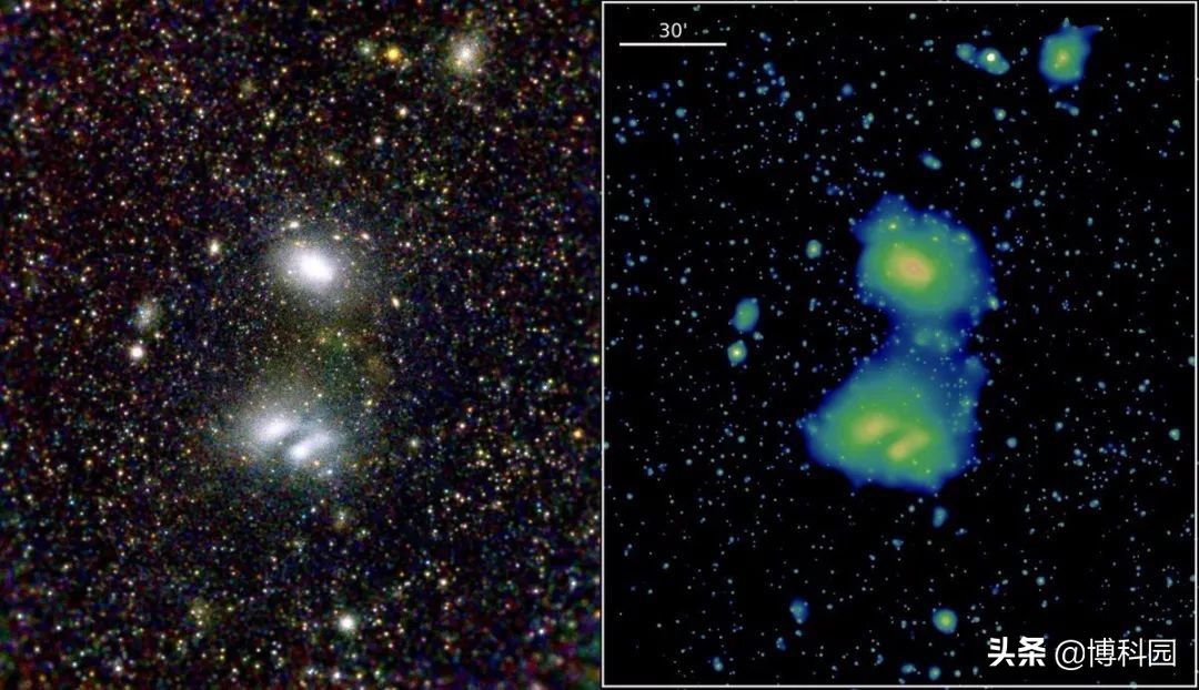 可见光显示了恒星所追踪星系的结构,但X射线主要是由中心生长的超大质量黑洞控制。在用光学望远镜看到星系团的地方,X射线揭示了巨大气体储存库填充了它们之间的空间,并追踪出宇宙的暗物质结构。随着其性能的证明,天文学家现在知道eROSITA望远镜将促使我们在理解充满活力的宇宙演化方面取得突破。进一步深入宇宙,A3391/3395相互作用的星系团系统eROSITA图像突出了促使宇宙中巨大结构形成的动力学过程。这些星团在eROSITA图像中显示为巨大的椭圆形星云,横跨数千万光年,每个星系团包含数千个星系。