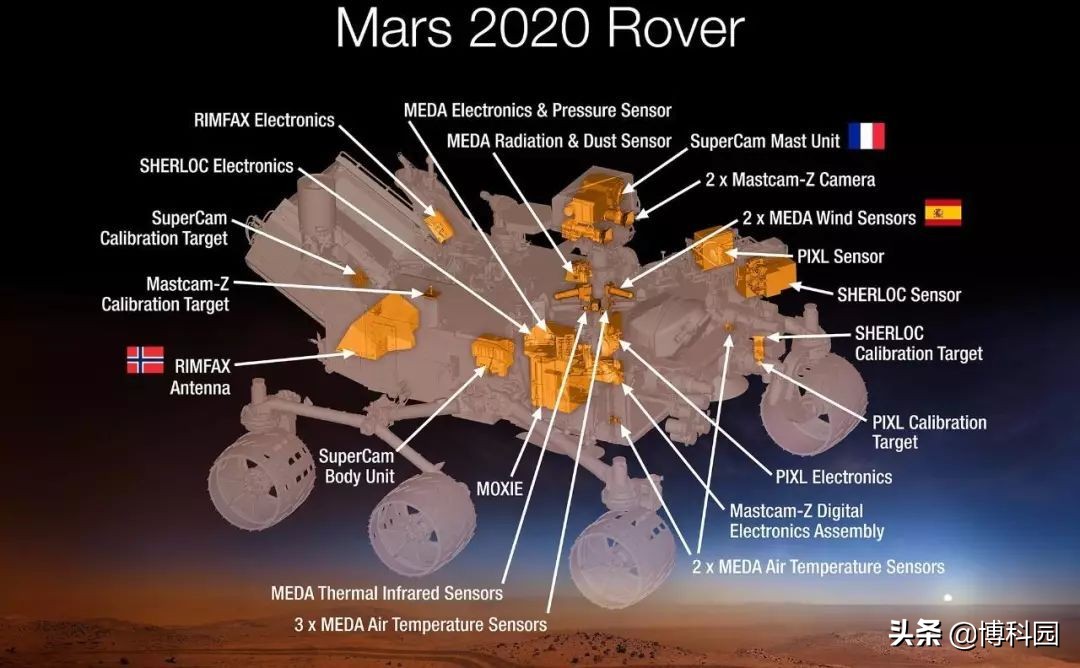 火星2020探测车的炮塔包括高清摄像机、具有拉曼光谱和有机化学发光(SHERLOC)科学仪器的可居住环境扫描设备、用于x射线岩石化学的行星仪器(PIXL),以及一个冲击钻和取芯机构。