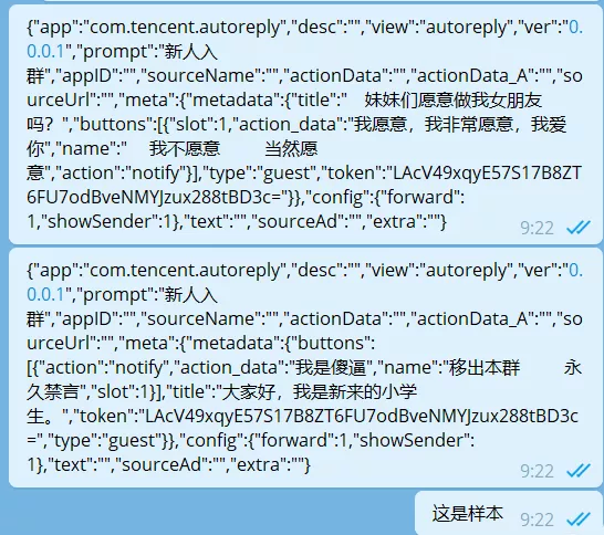 总结:反正就是,腾讯为了实现自己的一些业务需求必然会写卡片的功能而且允许用户发送,比如王者荣耀或者吃鸡的邀请啊这一类的,但是这些接口原本是隐藏的,普通用户接触不到的,有一些修改QQ的软件或者QQ机器人可以直接访问这些接口,就让用户把自己定义的东西发出去了。那个点击回复自然也是腾讯自己写的功能,形式上和你天天在QQ群里见到的各种卡片没区别,只不过内容上被改了而已。