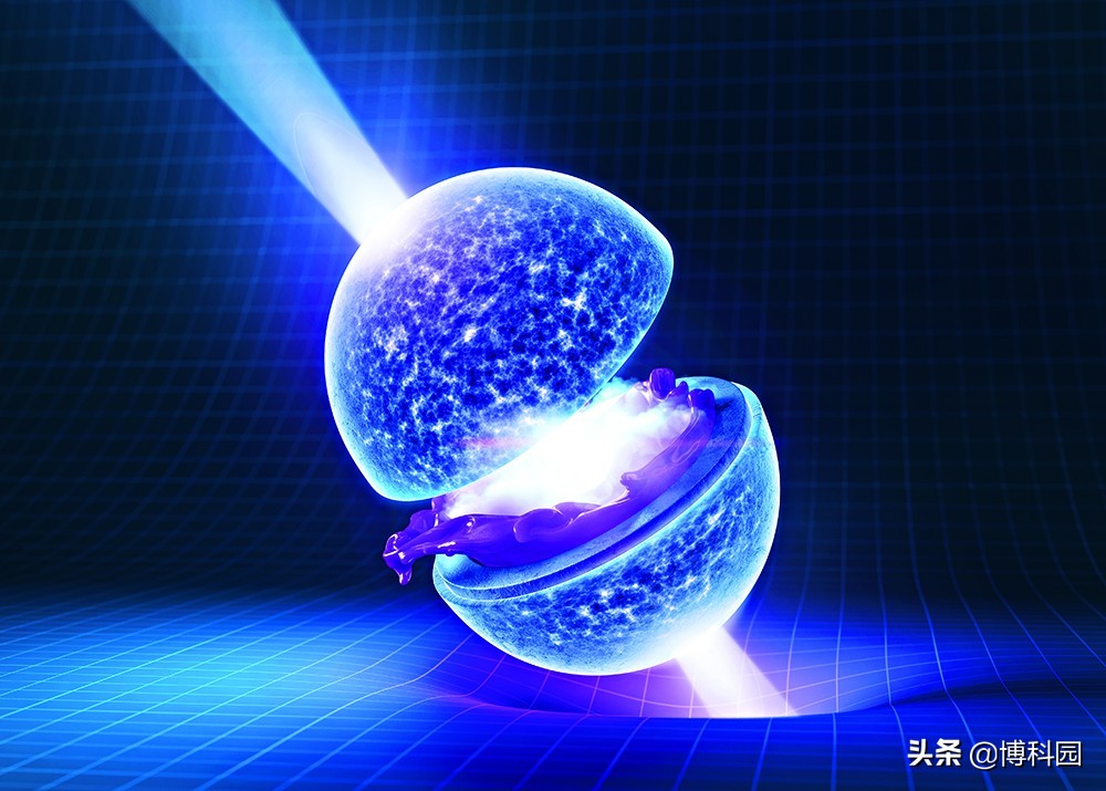 因为我们不能把中子星切开看看里面有什么,所以没有一个简单的方法来判断这些理论哪个才是正确的。尽管如此,科学家还是取得了一些进展。一个重大突破出现于2017年8月,研究者通过地面实验探测到了两颗中子星正面相撞产生的引力波。引力波是大质量物体加速运动时产生的时空波动,这次检测到的引力波携带了两颗发生碰撞的中子星的质量和大小等重要信息,利用这些信息,科学家就可以进一步确定中子星的性质和内部成分。