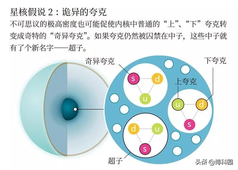 - 而其他理论提出,中子星里面的物质状态比这更奇怪。或许中子星内部的中子被分解成了更基本的粒子,即夸克和胶子,它们在自由粒子的海洋中无拘无束地游动着。