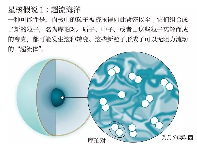 “对这种异常高压和高密度状态下的物质,我们的认识还处于假说阶段。” 奥尔福德说,“我们认为,中子实际上可能已经被压碎了并互相重叠,所以你无法将它看成中子流体,而是应该称其为夸克流体。”这种流体具体是什么形式的,仍是个没有定论的问题。一种可能是,夸克形成了“超流体”,这样的流体没有黏性,理论上一旦运动起来就永远不会停下来。中子星内部出现这种离奇的物质状态是可能的,因为夸克之间的关联性使得它们在足够靠近时可能形成束缚的“库珀对”。