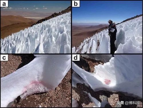 到那里去并不是一件小事,这也是为什么人们对这些构造研究得不多的原因之一。在到达海拔16000英尺(4876米)的penitente油田后,科学家们注意到一片片红色斑点,这是微生物活动的一个明显迹象,此前在世界各地的其他冰雪构造中也观察到了这种现象。