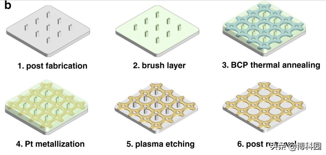 研究人员发现,如果在衬底上产生重复的线条或柱子图案,然后在该表面形成一层嵌段共聚物薄膜,来自衬底的图案将在自组装材料中复制。但这种方法只能产生简单的图形,如点或线的网格,在新方法中,有两种不同、不匹配的模式。