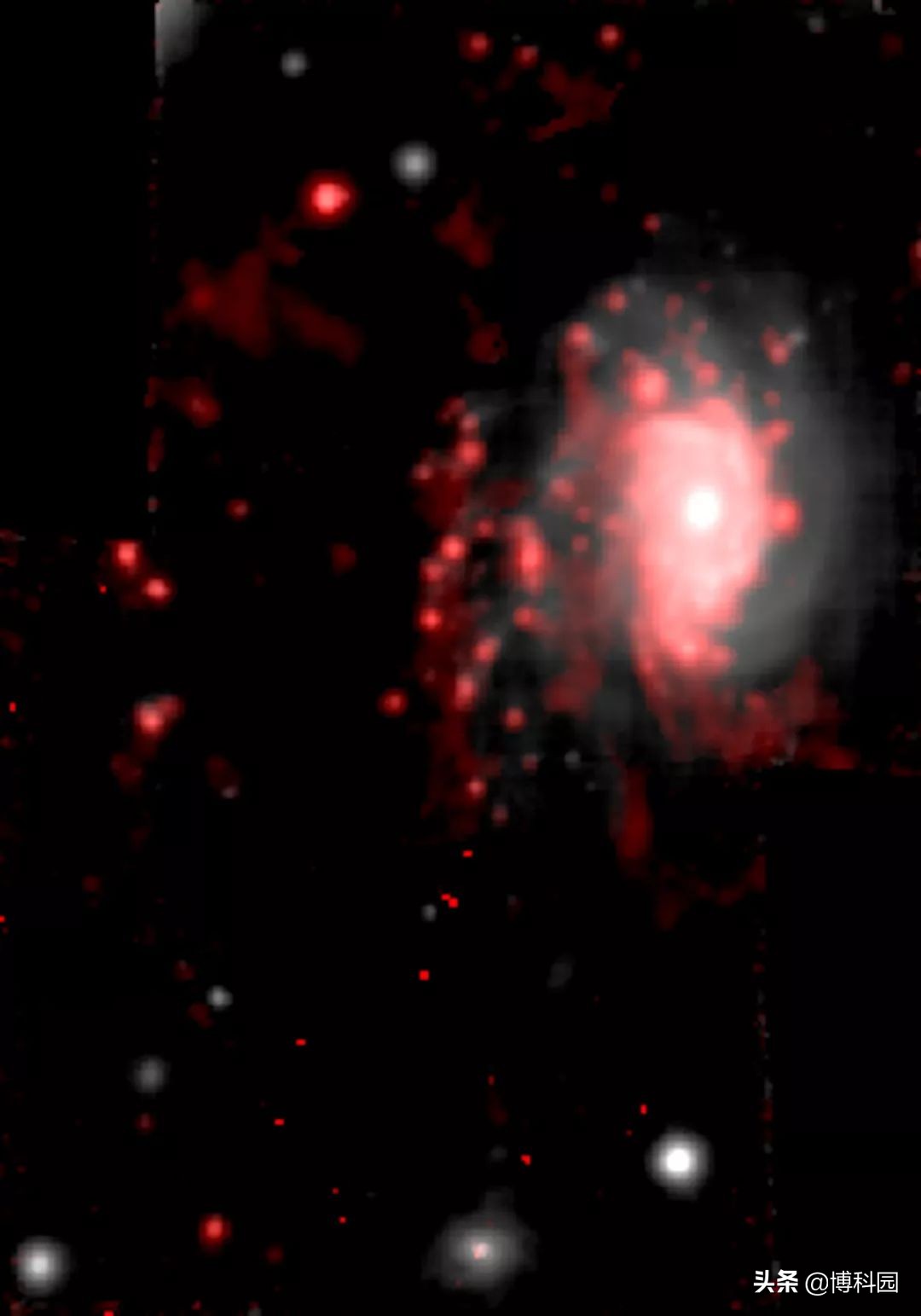 这意味着星系正在从内部被掏空,同时也在从外部被撕裂。到目前为止,JO201是超大质量黑洞和冲压压力剥离在水母星系中“熄灭”恒星形成过程中的一个独特例子。研究这些奇怪的物体,可以让我们了解星系经历的复杂过程。图显示水母星系JO201/JW100/JO194中恒星和气体分布三维模型相互作用的可视化。该模型是利用天空中恒星和气体的空间分布建立,速度沿视线给出了深度,红色=氢,蓝色=氮,绿色=氧,白色=星星。