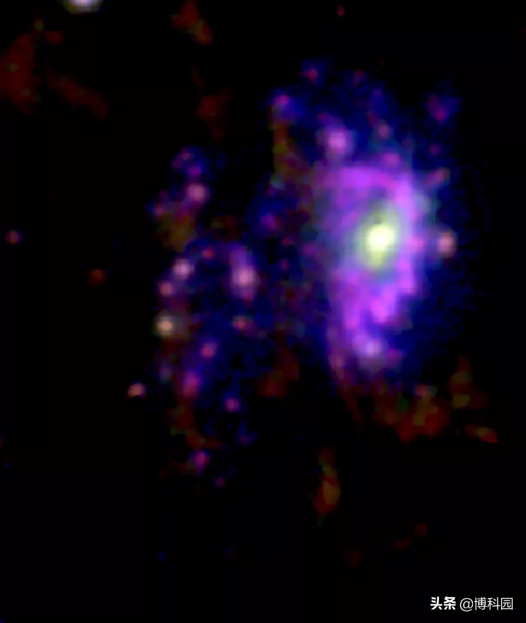 但是研究小组估计它们在jo201之后的距离是94千帕秒——大约是我们银河系直径的三倍。星系通过不断从气体中形成新的恒星来维持自身,因此了解气体如何进出星系有助于了解它是如何演化的。JO201的例子表明,当它穿过星系团并面临越来越多的气体被极端剥离时,平衡是如何向远离恒星形成的方向倾斜。由于冲压压力剥离过程,JO201向水母星系的转变导致了恒星形成短暂增加。压缩的气体云已经坍缩,在星系的圆盘上形成了一圈恒星。