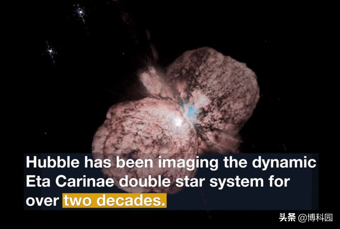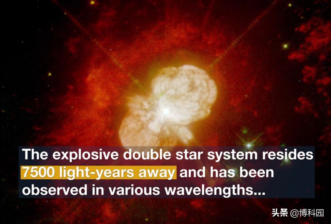 哈勃望远镜提供了一个关于船底座埃塔双星系统膨胀气体的特殊视角,这些气体以红、白、蓝三种颜色发光,这是NASA/ESA哈勃太空望远镜拍摄船底埃塔的最高分辨率图像,并于2019年7月1日公布。想象一下,近两个世纪前开始爆炸的慢动作烟花,从那时起就没有停止过。你可以这样描述这个位于7500光年外船底座的双星系统。