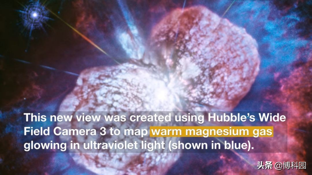 这些炽热的星云被称为侏儒星云,自1990年哈勃望远镜发射以来一直是它的目标。事实上,这颗恒星已经被哈勃太空望远镜上几乎所有仪器拍摄了超过25年。天文学家们以更高的分辨率观测到了这出宇宙大戏。这张最新照片是用哈勃的广域相机3拍摄的,它描绘了在紫外线下炽热的镁气体(蓝色部分)。科学家们早就知道,19世纪40年代抛出的外层物质,是被撞击到先前从恒星喷射出物质时产生的冲击波而被加热。