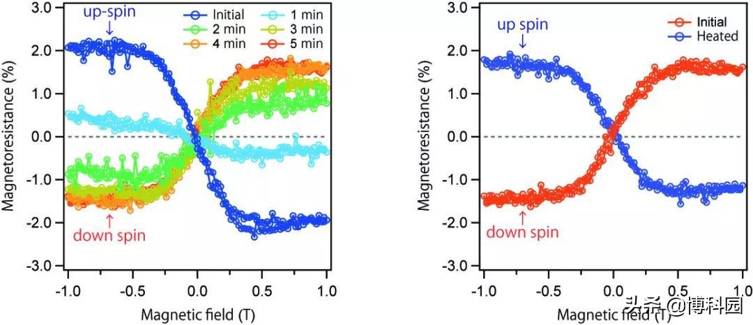 - (图示)(左)左旋异构体制备器件在不同可见光照射时间后的MR曲线,(右)右旋异构体热处理前后的MR曲线。