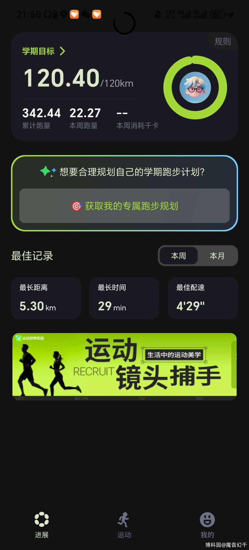 120公里校园跑跑完啦,还破PB进入4分30配速啦(5公里)